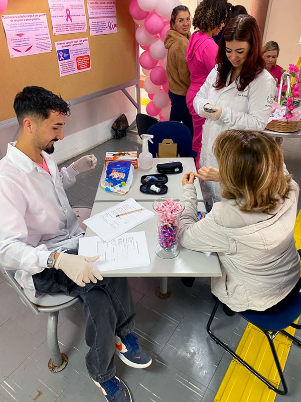 Farmácia: Encantou a todos realizando testes de glicose capilar, mostrando a importância de manter os cuidados com a saúde no dia a dia.