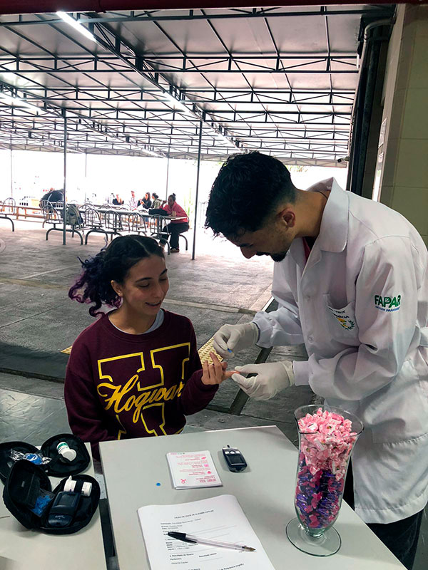 Farmácia: Encantou a todos realizando testes de glicose capilar, mostrando a importância de manter os cuidados com a saúde no dia a dia.